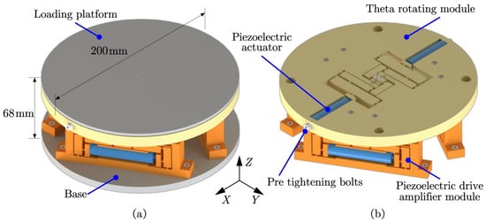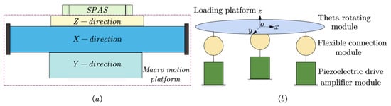 With the rapid development of the modern manufacturing industry, the accuracy requirements for ultra-precision machining and inspection are getting higher and higher. Submicron and even nanometer-level accuracy alignment systems are essential for various applications, such as wafer-level manufacturing and inspection, mass transfer and packaging of microminiaturized semiconductor products, robotic micro/nanomanipulations, and precision optical device polishing, etc. [1,2,3,4]. However, traditional high-precision motion systems with 3-DoFs () fail to account for pitch, yaw, and small angular deviations [5]. These errors, at the spatial scale, pose critical challenges for the increasing miniaturization and integration of devices [6,7,8]. Moreover, relying solely on traditional flexure-based nanopositioning stages can provide submicron or nanometer accuracy, but it is hard to meet the large travel range requirements [9]. Therefore, how to develop a large-stroke nanopositioning system with multi-DoF levelling and deviation and compensation control function is critical to achieve the above advanced submicron or even nanoscale manufacturing.