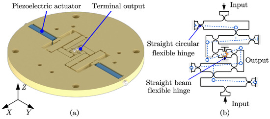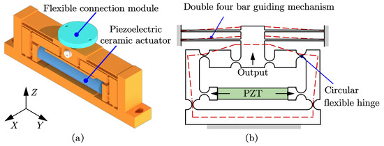 This study employs a hybrid ZTT module integrating dual four-bar displacement guidance mechanisms and lever-bridge hybrid displacement amplification mechanisms. The piezoelectric amplification module of the SPAS is shown in Figure 3a. Although the design of the lever-type amplification mechanism is simple, its non-compact nature makes it prone to lateral parasitic displacement generation. Conversely, the bridge-type amplification mechanism exhibits a simple and compact structure, high displacement amplification factor, and good linear output displacement. However, it has low output stiffness and inadequate dynamic performance. The lever-bridge hybrid amplification mechanism, which combines the principles of lever amplification and bridge pressure rod instability, combines the benefits of a simple and compact structure, high displacement amplification factor, and good linear output displacement, while also improving the stiffness of the output end, thereby ensuring superior dynamic performance.