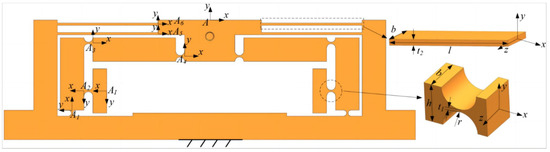 The symmetrical design of the piezoelectric-driven amplification module allows for the analysis of its left half initially. The comprehensive coordinate system and precise parameters are shown in Figure 5.