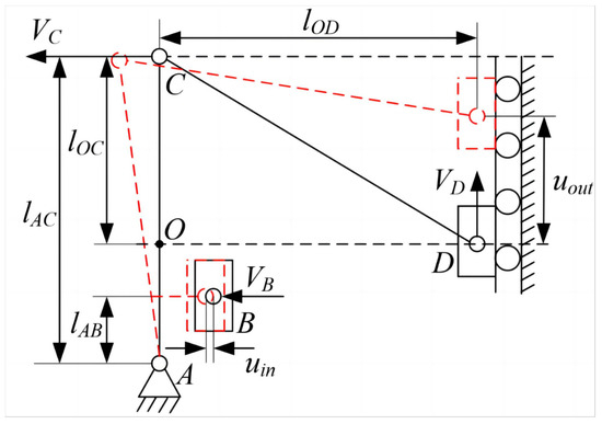 As shown in Figure 6, the motion diagram of the left half of the piezoelectric drive amplification module is shown. The displacement amplification ratio, defined as the ratio of the output displacement to the input displacement, is derived from the compliance matrix and displacement relationship. Mathematically, the amplification ratio may be expressed as