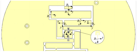 In the amplification module, the flexibility matrix (where ) represents the local flexibility matrix of point i in each element. When calculating the output compliance matrix, it can be deduced that Hinge 2 has no significant impact and can be disregarded at this stage. Therefore, the Flexure Hinges 1, 2, and 3 in the amplification module’s branch chain belong to series connections, and the local coordinate systems of Hinges 1, 3, and 4 are connected to in the coordinate system . Converting the flexibility matrix of () to the coordinate system , it can be concluded that
