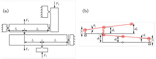 As shown in Figure 8a, the dimensions of the two-stage lever displacement amplification mechanism within the rotation module are presented. This mechanism exhibits a pronounced amplification effect, resulting in a substantial output displacement at the terminal stage. As shown in Figure 8b, the simplified analysis diagram of a two-stage lever-type displacement amplification mechanism reveals the straight circular flexure hinge at the fixed end as a rotating pivot. Its displacement is represented by a linear spring moving perpendicular to the rigid link and a rotating spring rotating around the pivot. During the actual calculation and analysis process, the deformation of the straight circular flexure hinge is calculated using the flexibility coefficient matrix. Subsequently, the displacement amplification ratio of the mechanism is obtained: