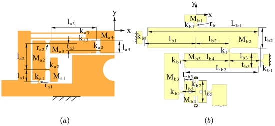 This paper uses the Lagrange equation method to establish the kinematic differential equations of the ZTT module (marked A) and module (marked B), respectively. Establish the dynamic model of the left half of the piezoelectric drive amplification module shown in Figure 9a, and the dynamic model of the upper part of the Theta rotation module shown in Figure 9b. Among them, by simplifying the straight circular flexure hinge and the straight beam flexure hinge into rotating torsion springs, the system is simplified as a spring-mass system. The kinetic energy of the system is generated by the movement of the rigid links in the mechanism, and the potential energy is generated by the elastic deformation of the straight circular flexure hinges and straight beam flexure hinges in the mechanism. The input displacement coordinate of the system is expressed as , is the displacement in the x-axis direction, is the displacement in the y-axis direction, and is the mass.
