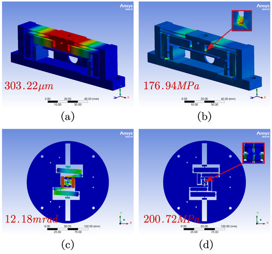 FEA results. (a) Maximum output displacement of the piezoelectric-driven amplifier module. (b) Maximum bending stress of the amplifier module. (c) Maximum output rotation angle of the rotation module. (d) Maximum bending stress of rotation module.