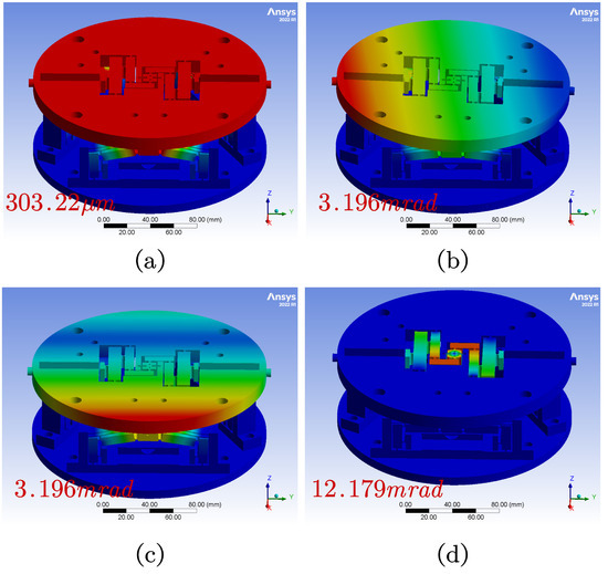 As shown in Figure 11a, when the identical displacement excitation is applied to the three Z-axis motion branches, the terminal motion stage generates an overall Z-axis feed motion, with the simulated output Z-axis displacement reaching 303.22 m. In Figure 11b,c, only one of the Z-direction motion branches is subjected to displacement excitation, while the remaining two Z-direction motion branches are in a free state. Consequently, the terminal motion stage produces yaw motion around the X and Y axes, with the simulation value of the output swing angle being 3.196 mrad. In Figure 11d, applying symmetrical displacement excitation to the rotation module results in rotational motion around the Z-axis, with the simulated output rotation angle value reaching 12.179 mrad. The simulation coupled errors of the SPAS are shown in Table 5, the results indicated that because of the symmetrical mechanism design, the coupled errors are very small.