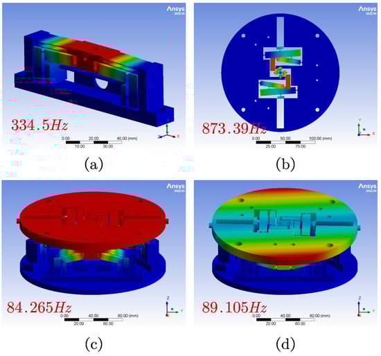 FEA results. (a) Natural frequency of the amplifier module. (b) Natural frequency of the rotation module. (c) First frequency of the ZTT stage. (d) Second frequency of the ZTT stage.
