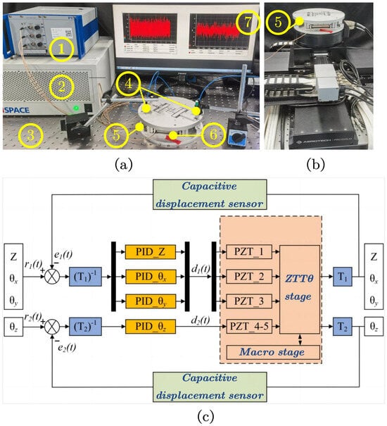 The 4-DoFs SPAS. (a) (1) PZT voltage amplifier, (2) controller system, (3) vibration isolation stage, (4) displacement sensor, (5) ZTT stage, (6) macroactuating PZT, (7) PC host system. (b) Aerotech macromotion stage. (c) Schematic diagram of control method.