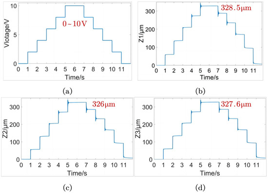 Open-loop step signal test diagram of piezoelectric drive amplifier module. (a) Input step voltage signal of piezoelectric actuator. (b) Output signal of Z1 module displacement. (c) Output signal of Z2 module displacement. (d) Output signal of Z3 module displacement.