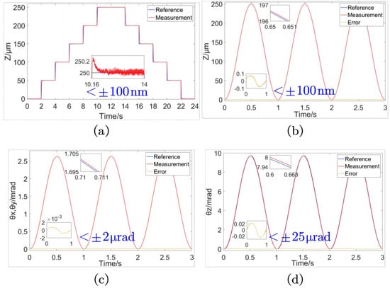 As shown in Figure 16b, a tracking test is performed on the Z-direction closed-loop sine signal of the positioning stage. The reference signal is shown in Table 7. The maximum steady-state error of the trajectory tracking is kept within ±100 nm, thus ensuring uniform ZTT positioning accuracy of ±100 nm for the Z-direction feed micro motion of the SPAS. Similarly, as shown in Figure 16c, a tracking test is conducted on the closed-loop sine signal of the positioning stage’s yaw motion. The reference signal is shown in Table 7. The maximum steady-state error of the trajectory tracking is kept within ±2 rad, thus allowing for the determination of the closed-loop positioning accuracy of the SPAS’s yaw motion around the X-axis and Y-axis to be ±2 rad. Lastly, as shown in Figure 16d, a tracking test is performed on the closed-loop sine signal of the positioning stage’s rotational motion. The reference signal is shown in Table 7. The maximum steady-state error of the trajectory tracking is kept within ±25 rad, ensuring uniform ZTT positioning accuracy of ±25 rad for the SPAS rotating around the Z-axis.