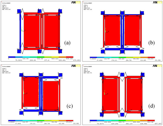 The gyroscope functions on the tuning fork principle, featuring a U-type connecting spring linking the dual-drive mass block and a drive spring connecting the dual-sense mass block. To examine its operational modes, Ansys software (Ansys 2022 R1) was employed for the simulation, as depicted in Figure 2. Notably, there is a significant frequency gap of over 1000 Hz between the first and fourth operational modes, with the fourth mode exhibiting a quality factor exceeding 2000, identifying it as the gyroscope’s drive mode. Figure 2a–d sequentially present the simulation results for the gyroscope’s operational modes. The first mode, the drive in-phase mode, involves the gyroscope’s double mass vibrating consistently with the X-axis. Following this, the second mode, the sensing in-phase mode, sees both masses vibrating simultaneously along the Y-axis direction. In contrast, the third mode, the sensing anti-phase mode, exhibits oscillations in the Y-axis contrary to the direction of the two mass blocks. Lastly, the fourth mode, the drive anti-phase mode, demonstrates oscillations of the gyroscope’s two mass blocks counter to the Y-axis. Additionally, the resonant frequencies for these four modes are observed at 2623 Hz, 3342 Hz, 3468 Hz and 3484 Hz. Remarkably, the fourth mode acts not only as the drive anti-phase mode but also as the primary driving mode. From this analysis, it is evident that the gyroscope’s two mass blocks have two degrees of freedom, while the drive mode and frame each exhibit only a single degree of freedom.
