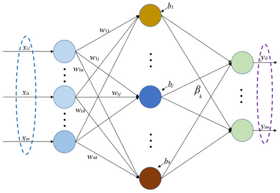 ELM is a feedforward neural network characterized by a single hidden layer. Its key innovation lies in the random generation of connection weights and biases specifically for the hidden layer, and no adjustment is needed after setting [28]. Compared to most neural networks, which need constant adjustment of their weights and thresholds, this method reduces the amount of computation by half. In addition, the output-layer connection weight β is determined once by solving the equations without iterative adjustment. Studies show that ELM has a high speed while ensuring learning accuracy [29]. The ELM network structure is given in Figure 4, and its theory is introduced as follows [30]: