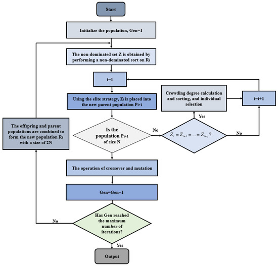 Figure 5 presents the algorithmic process of NSGA II: Firstly, the initial population Pt, comprising N individuals, is randomly generated. Subsequently, the offspring population Qt is derived using the fundamental operations of the genetic algorithm. Then, the new population Rt with a population size of 2N is obtained by reconstructing Pt and Qt. According to the elite strategy, Pt+1 is obtained by selecting the optimal N individuals in Rt, and their offspring population Qt+1 is obtained again through the genetic algorithm. The new population Rt+1 is then constructed, and the described steps are iteratively executed until the stop condition is satisfied.