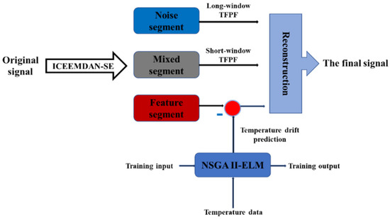 Relying on the aforementioned algorithms, we propose a hybrid algorithm named ICEEMDAN-SE-TFPF and NSGA II-ELM for gyroscope temperature compensation. The algorithm logic diagram is shown in Figure 6, and the specific steps are as follows: