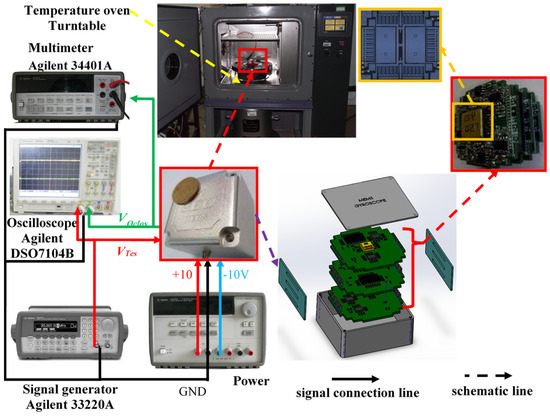 The setup for the temperature experiment on the gyroscope is shown in Figure 7. A detection circuit was distributed across three separate PCBs. Metal pins served not only to interconnect the electronic signals within the detection circuit but also to facilitate the connections between the three PCBs, each of which was encased in a rubber pad. Subsequently, the rubber-wrapped PCBs were placed within a metal shell, a measure that effectively safeguarded the chip’s structure while minimizing the risk of severe impact. To mitigate electromagnetic interference, the ground signal was connected to the metal shell. Additionally, one of the three PCBs served as a weak signal interface with the structural chip, while the other two functioned as induction and drive circuits, respectively. The experimental setup included a temperature-controlled oven, a multimeter, a signal generator, and a DC power supply of ±10 V. The experimental procedure unfolded as follows: Initially, activate the gyroscope and allow it to stabilize at room temperature for one hour. Next, rapidly raise the temperature-controlled oven to 60 °C to ensure that the gyroscope housing reaches a consistent temperature of 60 °C, maintaining this temperature for an additional hour. Subsequently, as the temperature in the oven decreases to 10 °C, the gyroscope continues to operate under these conditions for an hour. Finally, as the temperature drops to −40 °C, the gyroscope operates for one final hour before concluding the experiment.