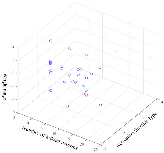 The mapping relationship between the parameters to be optimized in ELM and the population individuals of the NSGA II algorithm is established. Here, the optimization interval of the hidden neurons was set to [0, 50], and the five most commonly used activation functions—‘sigmoid’, ‘sin’, ‘hardlim’, ‘tribas’ and ‘radbas’—were selected for testing. In order to optimize the input-layer connection weights, the scaling factor λ is introduced to limit the range of the input-layer connection weights. Therefore, the value range of the input-layer connection weights can be expressed as