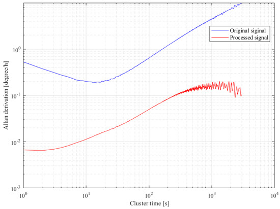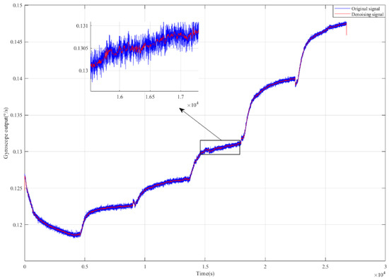 Figure 8 shows the temperature experiment results from the gyroscope. It can be seen that the gyroscope’s output presents a nonlinear relationship with the temperature change. As the temperature changed from 60 °C to −40 °C, the output shifted from 0.115° to 0.15°, and the gyroscope’s output signal contains not only temperature drift but also noise.