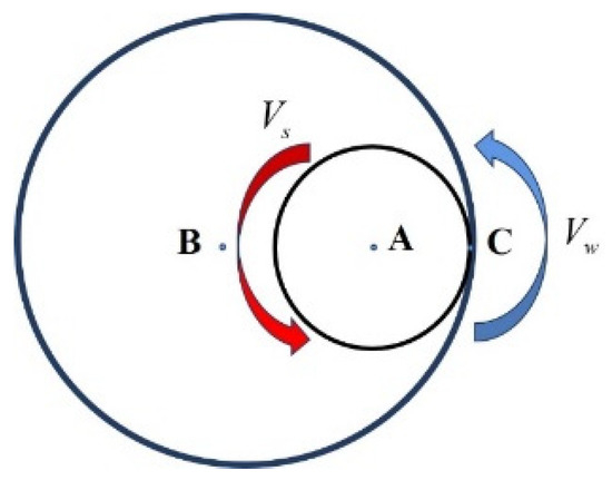 In order to simulate the movement of the contact area in the process of grinding the inner raceway of the bearing outer ring, it is necessary to calculate its relative motion speed as the loading speed of the moving heat source. The calculation diagram is shown in Figure 2, where point A is the center of the grinding wheel, point B is the center of the outer ring of the bearing to be machined, and C is the theoretical contact point. The grinding mode is smooth grinding, that is, the rotation direction of the grinding wheel is the same as the rotation direction of the ring. The specific legend is as follows: