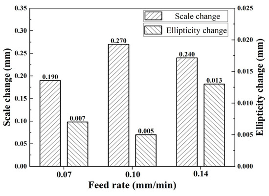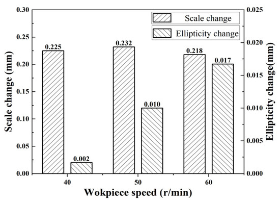 Through data organization and calculation, the influence of workpiece speed on the change in inner diameter size and ellipticity is shown in Figure 4. Through data organization, it can be found that the dimensional change as well as the change in ellipticity increase with the increase in workpiece speed.