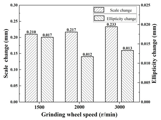 It can be seen in Figure 5 that the change in inner diameter size increases with the increase in grinding wheel speed, but the change in ellipticity is less affected by the rotational speed of the grinding wheel.