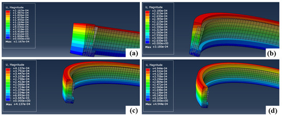 The initial temperatures of the model are 500 °C, 1000 °C, 1500 °C, and 2000 °C, respectively. It can be seen from Figure 7 that the deformation of the outer ring increases with the increase in temperature.