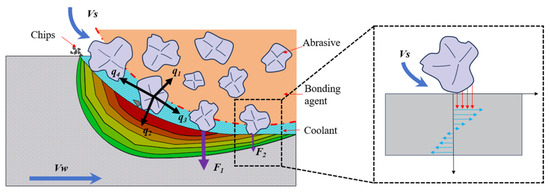 Experimental and simulation results show that the deformation of the outer ring increases with the increase in both the workpiece speed and grinding wheel speed. As can be seen from Figure 10, the blue arrows represent the speed of motion, the black arrows represent the heat flux distribution, and the purple color represents the stresses. The heat flux generated in the grinding process of the grinding wheel is divided into the heat flux q1 transmitted to the grinding wheel, the heat flux q2 transmitted to the workpiece, the heat flux q3 carried by the coolant, and the heat flux q4 carried away by the grinding chips, where q2 is the heat flux qw calculated by Equation (7). Under the influence of the grinding temperature, the surface layer of the material is subjected to residual tensile stresses, which gradually transform into residual compressive stresses as the depth increases. When the heat flux is large, the thermal stress generated after grinding is also large, resulting in greater deformation of the workpiece.