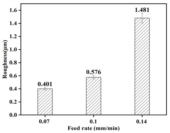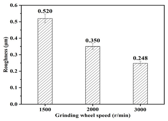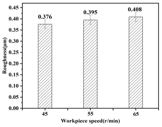 It can be seen from Figure 11 that the roughness increases with the increase in the workpiece speed. The reason for this phenomenon is that with the gradual increase in the workpiece speed, the number of abrasive particles in the unit time of the grinding wheel decreases, thus increasing the surface roughness value of the machined surface.