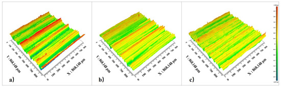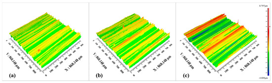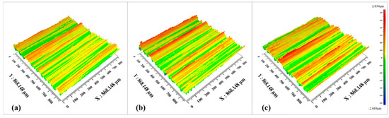 Three-dimensional morphologies under different grinding wheel speeds: (a) grinding wheel speed 1500 r/min; (b) grinding wheel speed 2000 r/min; (c) grinding wheel speed 3000 r/min.