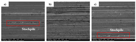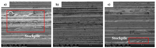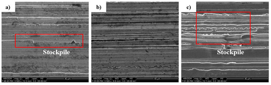 SEM 2D morphology at different workpiece speeds: (a) workpiece speed 45 r/min; (b) workpiece speed 55 r/min; (c) workpiece speed 65 r/min.
