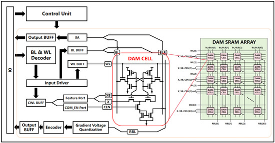The overall macroscopic structure of the DAM SRAM computational module comprises several integral components: a 64 × 64 array of DAM SRAM cells, 64 Gradient Voltage Quantization and Encoder (GVQE) circuits distributed along the column lines, a control unit, decoder circuits for address translation, driver circuits, and input/output buffer (BUFF) circuits, among others.