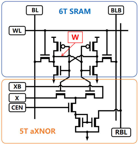 As illustrated in Figure 2, the proposed DAM SRAM core’s overall architecture comprises a 64 × 64 in-memory computing array (DAM SRAM ARRAY), 64 Gradient Voltage Quantization and Encoder circuits distributed per column, a control unit, decoder circuitry, driver circuits, and input/output buffers. Fabricated using SMIC 55 nm process technology, it exhibits a superior energy efficiency of 21.95 TOPS/W, a data throughput of 109.75 GOPS, and an output precision of 5 bits while operating at a frequency of 500 MHz. This design successfully maps various algorithmic steps of binary neural networks onto the in-memory computing architecture, thus significantly reducing the overheads of DSP circuits and optimizing the cell area and layout in order to increase the integration density and energy efficiency ratio. The contributions of this work are summarized as follows: (1) The development of an innovative 11T SRAM cell that integrates storage and computational functionalities, enables large-scale parallel Multiply–Accumulate (MAC) operations to be performed within a memory SRAM array, and achieves ahigh utilization of area and a compact layout; (2) the implementation of a dynamic aXNOR computation mode that drastically decreases both the computational and static power consumption of the array; and (3) the design of a voltage gradient quantization circuit that is able to enhance the operational accuracy.