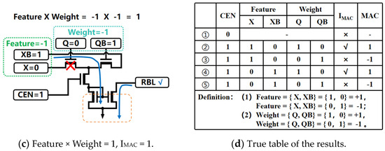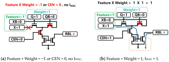 (2) If the Feature signal pair {X, XB} has a value of {0, 1} (representing −1) and the Weight signal pair {Q, QB} has a value of {0, 1} (also −1), although both are negative, their product is still +1, resulting in a mirrored current IC on RBL.