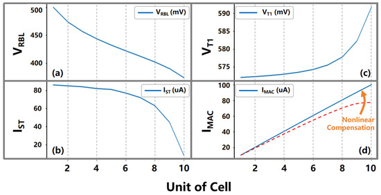 (a–d) The proposed voltage gradient quantization circuit addresses the non-linear attenuation issue of voltage gradients caused by the current accumulation effect on RBL through a self-stabilizing operating mechanism. While the self-stabilizing loop does not directly solve for the voltage drift phenomenon on the RBL current accumulation bus, it compensates for the non-linearity of the MAC currents by elevating the bias voltage of ZFET1.