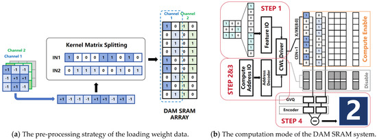 Before executing a convolutional layer operation, the DAM SRAM core enters the SRAM mode, loading image-relevant weight data column-wise into the DAM SRAM core array. A pre-processing strategy in which the convolution kernel is vectorized and decomposed is proposed. After the weight loading phase, the DAM SRAM system transitions from the storage mode to the computation mode.