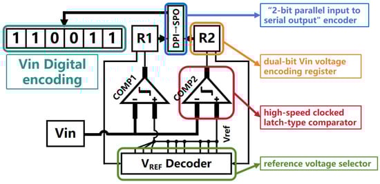 In the present design, the implementation of a gradient voltage encoding circuit is employed for both the ADC and output stage, comprising two high-speed clocked latch-type comparators, a dual-bit Vin voltage encoding register (R1 and R2), a reference voltage selector, and a “2-bit parallel-to-serial output” encoder.