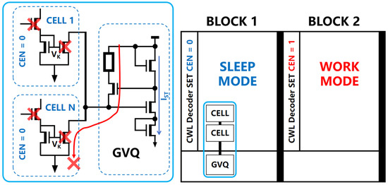 In the block dormancy mode, as shown in Figure 9, when Block 1 in the DAM SRAM array is instructed to enter dormancy, the entirety of Block 1’s COM_EN port sets the CEN signal to a low level, thus disabling the internal computational pathways of all DAM SRAM units within the block. The node voltage VK within the aXNOR structure is pulled down, preventing the formation of a current path in the left branch of the voltage gradient quantization circuit; this leaves only a small static current IST in the right branch, thus enabling the block to achieve a low-power sleep mode.