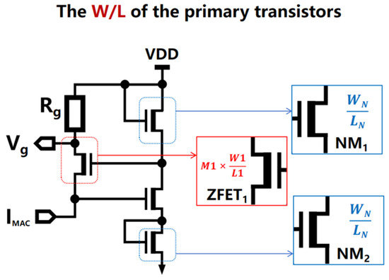 In the proposed design, the voltage gradient quantization circuit utilizes a self-stabilizing voltage operating mechanism, which addresses the non-linear decay caused by the effects of RBL current accumulation; this allows the accumulated analog current signals to be accurately quantified and ensures that the gradient of the output voltage Vg remains linear, thereby mitigating the occurrence of non-linear decay phenomena. As shown in Figure 11, three critical parameters are considered in the voltage gradient quantization circuit: (1) the channel length (L1) of ZFET1, (2) the channel width (M1 and W1) of ZFET1, and (3) the aspect ratio (WN/LN) of NM1/NM2 transistors; these parameters have a significant impact on the performance of the circuit, including its quantization precision (computational linearity), consumption of static and computational power consumption per unit area, and circuit area.