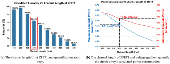 Considering a unit channel width of 500 nm for ZEFT1, with M1 denoting a finger count of 20, and an aspect ratio of 120 nm/300 nm for the NM1/NM2 transistors, this study investigated the impact of varying the channel length L1 of the ZEFT1 transistor on the quantization precision and minimum (with only one computational unit current) to maximum (with eight computational units of current) computational power consumption of the voltage gradient quantization circuit. As depicted in Figure 12, while increasing L1 led to improvements in the minimum and maximum computational power consumption of the 64 × 1 array circuit, it simultaneously reduced the precision and linearity of the accumulated current quantization. Consequently, taking into account the circuit area, power consumption (minimum computational power < 0.55 mW/mm2, maximum computational power < 11.5 mW/mm2), and linearity (linearity > 98% with eight computational units), the channel length L1 of the ZEFT1 transistor was set at 300 nm.