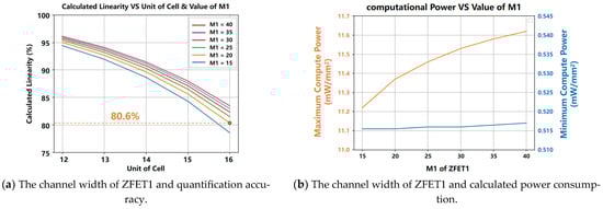 Owing to ZEFT1’s fixed channel length L1 of 300 nm and unit channel width W1 of 500 nm, the effect of changing the total channel width M1 × W1 via modifying the number of fingers (M1) on the precision of quantization and consumption of computational power per unit area was examined. As shown in Figure 13, with M1 increased, under the same number of computing units, both the quantization precision and consumption of computational power per unit area increased. As can be seen from the blue curve that, when there were 16 computing units, the quantization precision approached 80%; at M1 = 10, the precision dropped below 80%. To ensure the precision of the system while limiting the number of simultaneously computed units to 16 or fewer, M1 was set as 20. This balanced the increase in computational precision against the rising consumption of computational power per unit area.