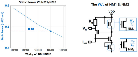 The aspect ratio WN/LN of NM1/NM2 governs the static current within the right branch array of the voltage gradient quantization circuit, thereby influencing its static power consumption per unit area and the minimum computational power consumption. As shown in Figure 14, experimental observations revealed that WN/LN had a relatively minor impact on the static current, maintaining a range of between 100 nA and 105 nA. Consequently, the determination of WN/LN for NM1/NM2 was primarily guided by the minimum computational current. With the objective of maintaining the minimum computational power consumption at below 0.5 mW/mm2, WN/LN was set at 120/350. During the experiment aimed at measuring the minimum computational power consumption, the primary focuses were twofold: ensuring a power level below 0.5 mW/mm2 and minimizing the circuit area while preserving symmetry. Given that each column of the SRAM is equipped with a GVQ circuit, circuit area optimization became a crucial consideration, necessitating a compact design that would not compromise the desired power threshold. Simultaneously, maintaining symmetry in the circuit layout was deemed vital for both functional efficacy and manufacturability. Based on these dual objectives, an aspect ratio of 120/350 was selected as it effectively strikes a balance between achieving the targeted low minimum computational power consumption and retaining a compact, symmetrical circuit layout, thereby satisfying both requirements and ensuring the overall efficiency and practicality of the design.