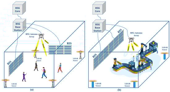 Specifically, Figure 1a illustrates a scenario within an indoor public space, wherein the data acquired from the LiDAR sensor system regarding the positions of individuals and objects are utilized by the B5G base station to conduct RIS and antenna array adjustments. Similarly, Figure 1b delineates an indoor factory environment. In both instances, the overarching aim is to significantly improve communication performance.
