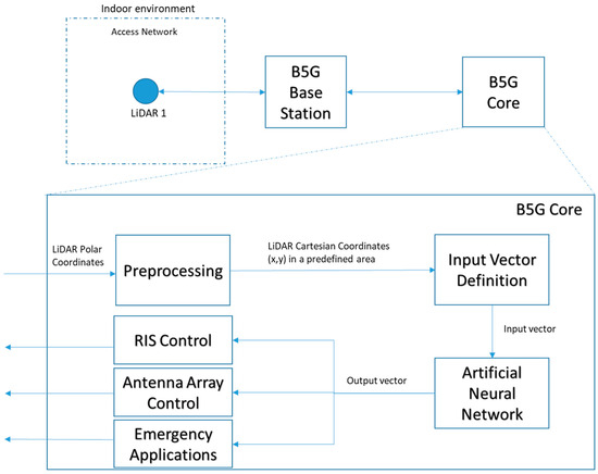 In indoor environments, conventional positioning techniques often exhibit significant imprecision, necessitating the integration of supplementary systems to enhance accuracy. In the context of advanced telecommunications, sensor data are transmitted to the B5G network core via a wireless access network. Within this framework, each sensor is treated as an individual network user, thereby consuming a portion of the network’s capacity allocated specifically for this application. The choice of 2D-LiDAR sensors is strategic, as they generate considerably less data, thus minimizing the impact on the network’s overall capacity. Additionally, the installation of the system requires the establishment of power supply points at strategic locations. At the network core, a dedicated computer is essential for processing the data in real time and disseminating this information to other applications, ensuring efficient and timely utilization of the positioning data.