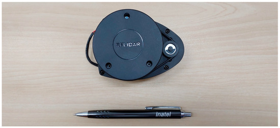 The RPLiDAR A1 presented in Figure 3 is a high-performance, compact-size time of flight (ToF) LiDAR using a laser centered at 785 nm, which is commercialized by SLAMTEC, from Shanghai, China. It features a 360° angular range and a measuring range from 0.15 to 12 m. The device provides a high sampling frequency of 12k samples/s and a rotational speed of 10 rpm. The dimensions of the RPLiDAR A1 are only 70 × 55 × 97 mm, making it suitable for integration into robotic systems.