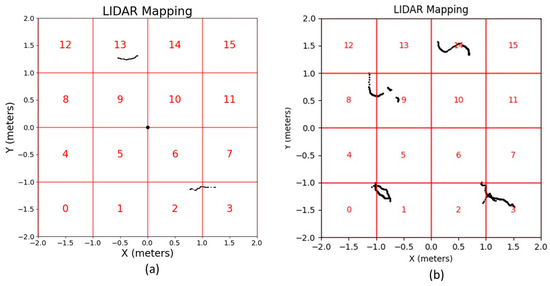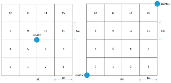 A laboratory-based test setup was established to implement the proposed ANN-based positioning and sensing system. LiDAR sensors were strategically positioned in the 4 × 4 m square grid. Despite the sensor’s 12 m range capability, the focus was restricted to this grid. The grid was subdivided into sixteen 1 × 1 m squares, sequentially numbered from zero to 15, as shown in Figure 4. Scenario 1 is shown in Figure 4a, using one LiDAR sensor in the center of the area, and Scenario 2 is shown in Figure 4b, using two LiDAR sensors on opposite vertices.