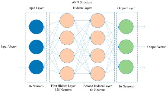 Dividing the data into 80% for training and 20% for testing balances the need for a substantial sample for training with an adequate amount for validation and testing over 16,000 epochs. The model is compiled with the binary cross-entropy loss function and optimized with the Adam algorithm. This algorithm is an efficient optimizer for most neural network use cases. The performance of the model is evaluated using accuracy, precision, recall, and F1 score [54]. Table 1 presents the ANN layer specifications for the training process.