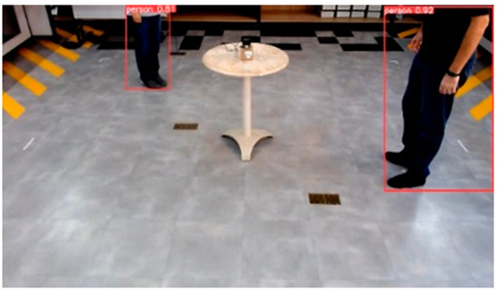 The sensing and positioning experiments were conducted in a teaching laboratory from our institute (Inatel), as shown in Figure 7. An indoor scene with two people positioned within the area of interest and the poses identified by a person detection algorithm. The you only look once (YOLO) person detection algorithm is employed to accurately detect and determine the coordinates of the individuals within the environment, automatizing the labeling process. The experiments were conducted in two scenarios. In scenario 1, two pedestrians randomly altered their positions every 20 samples, aiming to emulate varied environmental conditions; the total number of samples was 1300; and just one LiDAR sensor was positioned in the center of the area. For scenario 2, four pedestrians randomly altered their positions every 20 samples; the total number of samples was 2000; and two LiDAR sensors were positioned on two opposite vertices of the area.