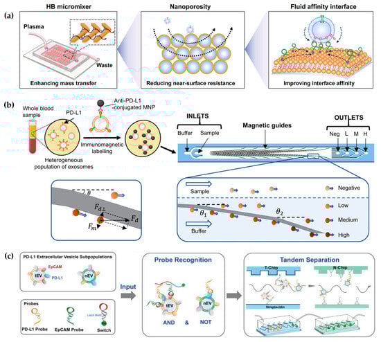 Different subtypes of EVs represent distinct sources and diverse biological functions. Therefore, the analysis of EV subtypes is crucial for studying the biological mechanisms of EVs. On the contrary, all antibody-based enrichment systems are limited to highly specific isolation protocols, which result in partial EV loss due to differences in the expression of EV membrane surface proteins. Chen et al. proposed a novel herringbone microfluidics device that not only possessed the advantages of herringbone microfluidics but also incorporated aptamer-functionalized core–shell bar codes (AFCSBs) [40]. Because their antiopal hydrogel shells have abundant interconnecting pores, barcodes can provide a rich surface area for the anchoring of multiple DNA aptamers, enabling the specific capture of multiple tumor-derived exosomes. However, its essence lies in using one type of aptamer for molecular capture and another type for molecular discrimination, making it still unable to distinguish different EVs. In order to isolate subtypes of EVs, MUN et al. developed a microfluidic chip-based magnetically labeled exosome isolation system (MEIS-chip) that involved magnetic nanoclusters (MNCs) conjugated with CD63 and HER2 with different degrees of magnetization (CD63 conjugated with low-saturation magnetized MNCs, CD63-LMC, and HER2 conjugated with high-saturation magnetized MNCs, HER2-HMC) [47]. Common exosomes were captured by CD63-LMC, while exosomes with HER overexpression bound to both CD63-LMC and HER2-HMC simultaneously. This allows for the acquisition of varying degrees of magnetic particles and magnetic separation in the MEIS chip via a magnetic field, ultimately resulting in the separation of different EV populations. Moreover, Chen et al. designed a nanoscale cytometry platform called NanoEPIC to enable the collection of small EVs (sEVs) bearing four different expression levels of PD-L1 by labeling them with antibody-functionalized magnetic nanoparticles (MNPs) (Figure 2b) [45]. EVs with higher PD-L1 expression levels had greater lateral deflection towards the edge of the device in the microfluidic flow channel due to their increased magnetic susceptibility resulting from binding to more MNPs. This facilitated the separation of sEVs based on four levels of PD-L1 expression: negative, low (exoL), medium (exo-M), and high (exo-H). Lu et al. achieved the isolation of tumor PD-L1+ EVs and non-tumor PD-L1+ EVs through DNA logic-mediated double aptamer recognition and a tandem chip for the first time (Figure 2c) [46]. Tumor-derived EVs were identified by EpCAM and PD-L1 nucleic acid ligands, induci ng the “AND” logic operation, whereas non-tumor-derived PD-L1+ EVs only express PD-L1, thus invoking the “NOT” logic operation. These two independent outputs facilitated the separation of tumor- and non-tumor-origin PD-L1+ EVs through tandem microfluidics, respectively. Consequently, utilizing a streptavidin-functionalized microfluidic chip (T-Chip), only tumor-derived PD-L1+ EV populations can be isolated. After excluding tumor-derived PD-L1+ EVs, the remaining PD-L1+ EVs from normal cells can be captured through hybridization between the extension sequence on the PD-L1 probe and the corresponding cDNA modified on the second microfluidic chip (N-Chip).