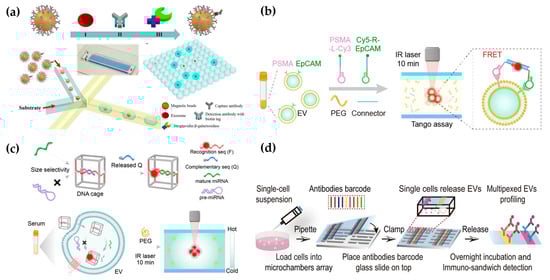 In addition to proteins on the EV surface, EV nucleic acids are also important biomarkers and therapeutic targets for diseases [66]. Shao et al. developed a microfluidic chip to capture exosomes and analyze the mRNAs of MGMT and APNG in enriched tumor exosomes [67]. This strategy has the potential to predict the drug responses of GBM patients. Sun’s group demonstrated a thermal swim sensor (TSN) employing nanoflares for the in situ detection of exosomal miRNA, eliminating the need for RNA extraction or target amplification. Through the thermophoretic accumulation of nanoflare-treated exosomes, a heightened fluorescent signal was produced upon binding with exosome miRNA, facilitating the direct quantitative assessment of exosome miRNA [68]. Afterwards, they devised a DNA tetrahedron-based thermophoretic analysis (DTTA) for the in situ detection of mRNA in EVs, achieving remarkable sensitivity and specificity [69]. Recently, they developed a DTTA for highly sensitive and selective in situ detection of mature miRNA in EVs. This assay achieved a detection limit of 2.05 fM for mature miRNA in EVs without interference from pre-miRNA and distinguished between breast cancer patients and healthy donors with an overall accuracy of 90% (Figure 3c) [58].