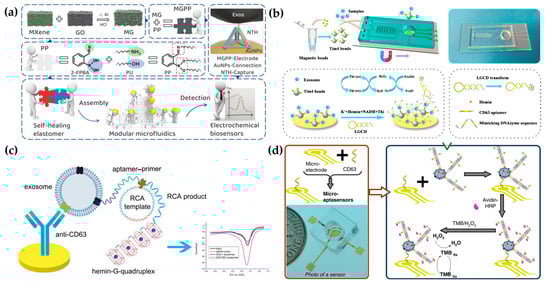 Microfluidic-based electrochemical detection: (a) TDN-based microfluidic electrochemical biosensing platform for exosome analysis. Reproduced from Ref. [81]. (b) Schematic diagram of the ExoPCD chip. Reproduced from Ref. [82]. (c) Hemin/G-quadruplex-assisted signal amplification. Reproduced from Ref. [83]. (d) Electrochemical micro-aptasensors based on HCR for exosome detection. Reproduced from Ref. [84].