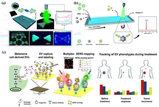 Various biomarkers can indicate diverse biological functions, making it significant to detect multiple exogenous biomarkers. Han et al. proposed a microfluidic-based SERS detection technique for profiling numerous exosomal biomarkers to diagnose osteosarcoma. Gold nanoparticles labeled with SERS tags can selectively bind to exosomes using specific antibodies in samples, forming exosome immunocomplexes. A microfluidic chip, comprising two symmetrical polydimethylsiloxane (PDMS) layers and a nanoporous polycarbonate track-etched (PCTE) membrane, was employed for exosome purification [91]. Microfluidic tangential flow filtration effectively eliminated plasma biomolecules and free SERS tags while enriching exosome immunocomplexes on the membrane for in situ SERS analysis [91,92]. Herein, Wang et al. also showcased a multiplex EV phenotype analyzer chip (EPAC). EPAC integrates a nanomixing-enhanced microchip and a multiplex surface-enhanced Raman scattering (SERS) nanotag system for direct EV phenotyping (Figure 5c) [90]. They observed the EV phenotypic heterogeneity and longitudinally monitored the EV phenotypic evolution, finding specific EV profiles involved in the development of drug resistance and the potential of EV phenotyping for monitoring treatment responses. Thus, the microfluidic-based SERS detection method offers great potential for the detection of external vesicles and cancer diagnosis.