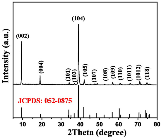 The phase purity and crystalline nature can be determined using the P-XRD technique [50,51]. In this study, the P-XRD pattern of the Ti3AlC2 MAX was obtained in the applied 2theta range of 5–80°. Figure 1 illustrates the P-XRD spectrum of Ti3AlC2 MAX. The P-XRD pattern of the Ti3AlC2 MAX shows three major diffraction peaks observed at 2theta values of 9.17°, 18.98°, and 38.97°, which can be assigned to the (002), (004), and (104) diffraction planes, respectively.